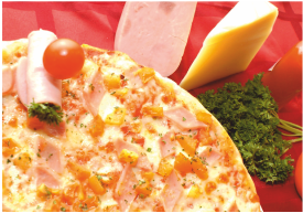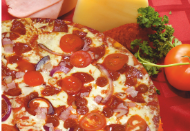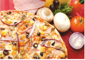 Сыр "Мацарелла", ветчина, грибы, томаты, лук, маслины.
