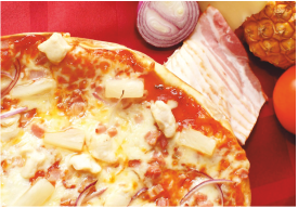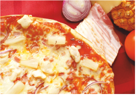 Соус "Барбекю", сыр "Моцарелла", куриное филе, кусочки ананаса, бекон, лук, томаты.