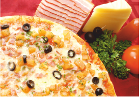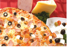 Сыр "Моцарелла", сыр Фета", ветчина, томаты, маслины.
