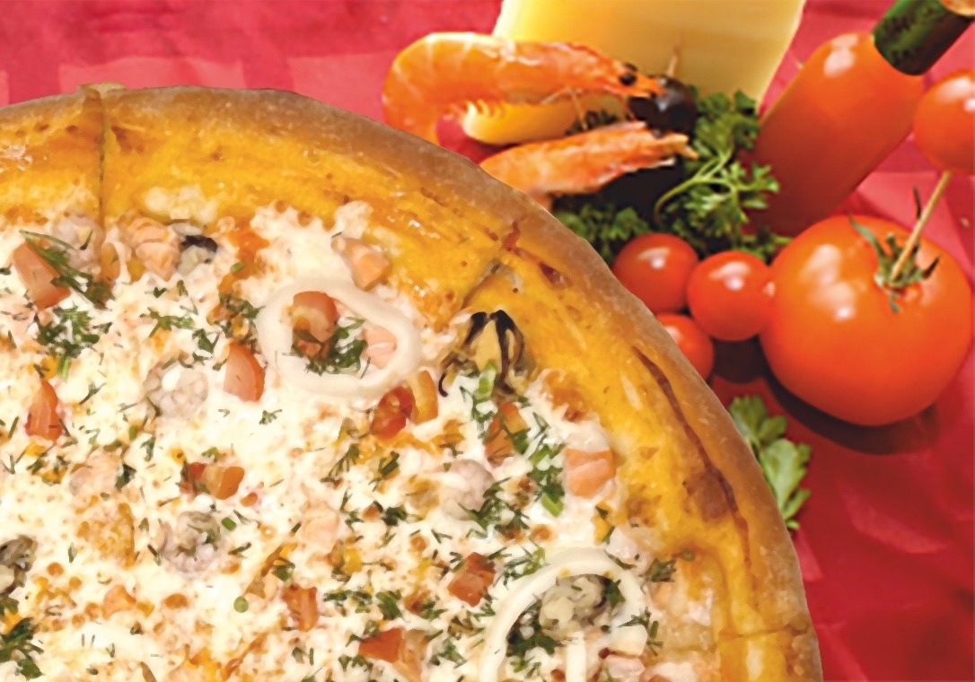 Соус,сыр Моцарелла,мидии,кальмар,креветки,лосось,томаты