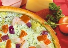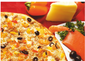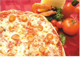 Сыр "Моцарелла", лосось, креветки, томаты, маслины , сыр "Пармезан".