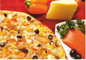 Сыр "Моцарелла", лосось, болгарский перец, маслины, томаты.