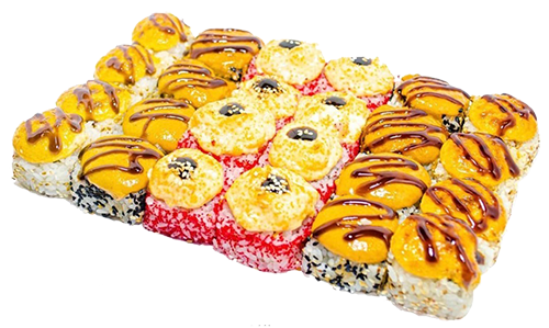 Запеченные роллы: с крабом, с креветкой, с кальмаром, с жареным лососем, с курицей, с луком.
