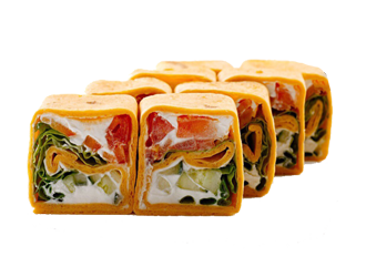 сыр, помидор, зеленый лук, пекинская капуста, огурец. Соевый соус, васаби и имбирь приобретаются отдельно